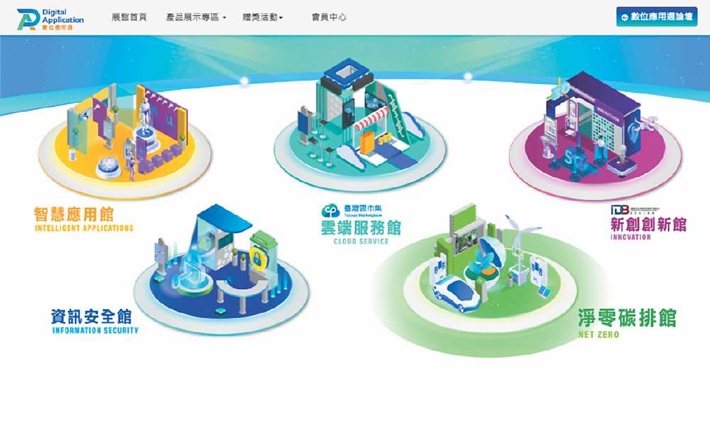今年度數位應用週以線上展覽的方式展出五大主題,分別為:「智慧應用館」、「雲端服務館」、「新創創新館」、「資訊安全館」、「淨零碳排館」,解決方案除了數位轉型相關科技應用外,亦包含不少淨零相關應用技術。