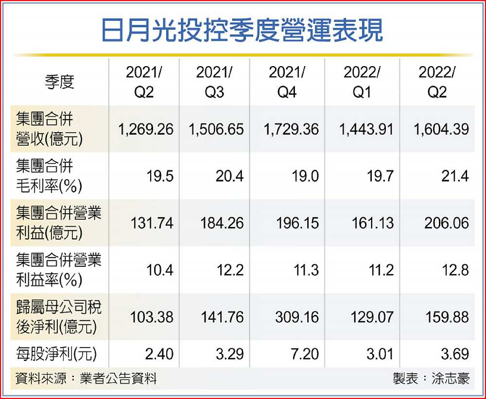日月光投控28日法說會,第二季集團合併營收1,604.39億元,稅後淨利159.88億元,同創歷史次高,每股淨利3.69元優於預期。日月光投控營運長吳田玉表示,在多元化的客戶組合及製造靈活性之下,下半年表現依然穩固,合併營收將逐季成長。法人看好第三季集團合併營收將季增10~13%並創歷史新高。