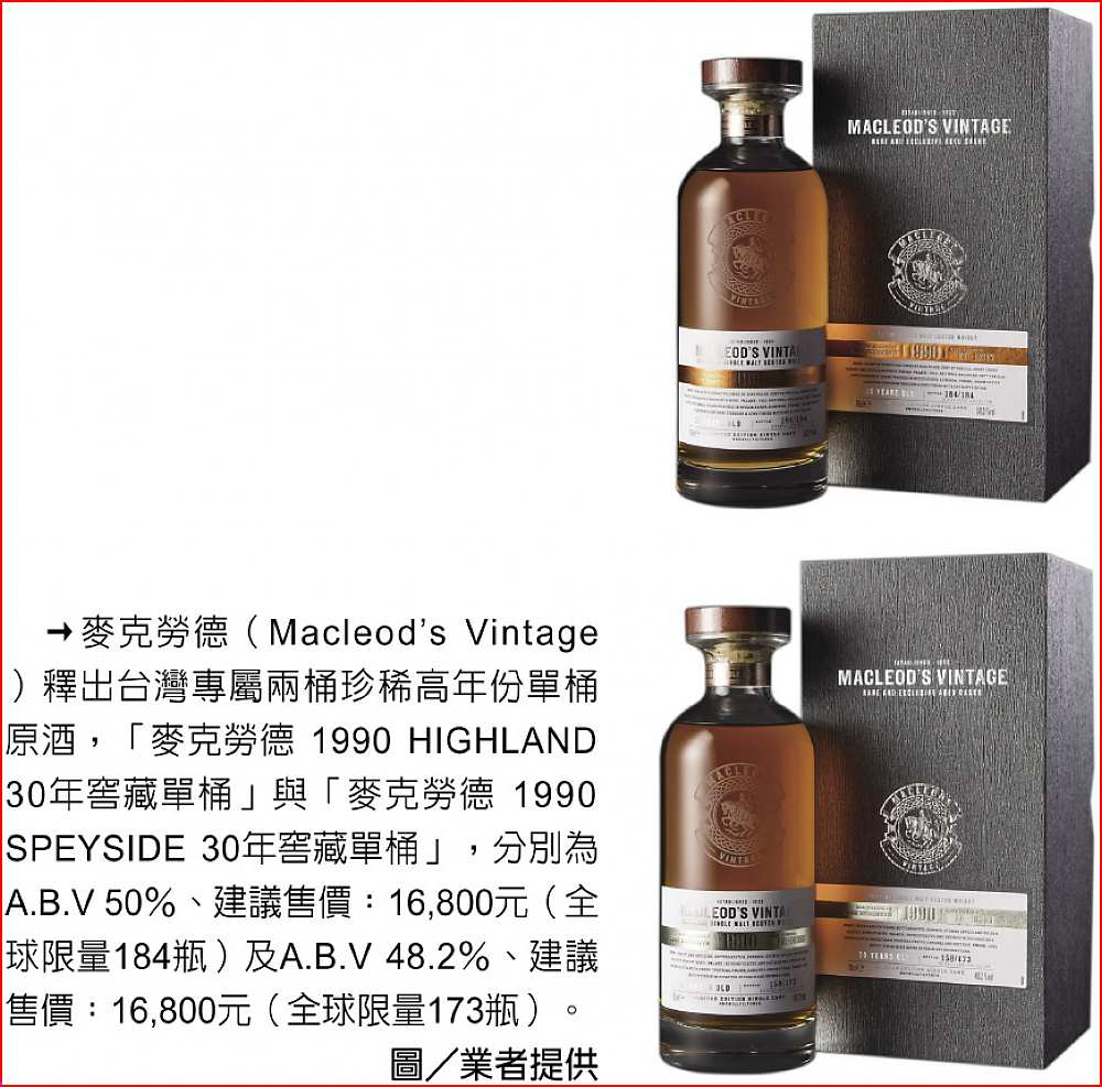 資深威士忌玩家占比極高的台灣烈酒市場,近年來越來越多人投入尋找自己喜愛的獨立裝瓶廠威士忌(Independent Bottler,簡稱IB),無論是追隨原桶強度、小批次生產或單桶等不同的威士忌樣貌,獨立裝瓶廠天馬行空的創意總能帶來超乎想像的風味,令專業品飲者趨之若鶩。世界前十大酒商麥立得旗下的IB品牌Macleod’s Vintage麥克勞德,近期釋出兩款30年珍稀窖藏單桶系列,分別呈現蘇格蘭Highland與Speyside兩大產區最具代表性的風味。