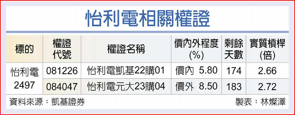 台股擺脫前一日大跌陰影,30日指數震盪收14,953.63點小漲0.18%。怡利電(2497)震盪上揚行情,盤中高檔達90元,收盤價84.6元、上揚0.71%,可留意相關認購權證。