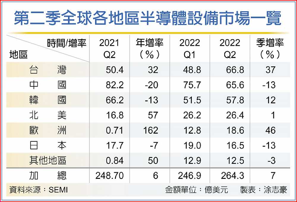 國際半導體產業協會(SEMI)8日發表全球半導體設備市場報告指出,今年第二季全球半導體製造設備出貨金額,較第一季成長7%來到264.3億美元,較去年同期成長6%,改寫季度出貨金額新高。其中,隨著台積電擴大資本支出並積極擴充先進製程產能,台灣地區擠下中國及韓國成為第一大設備市場。