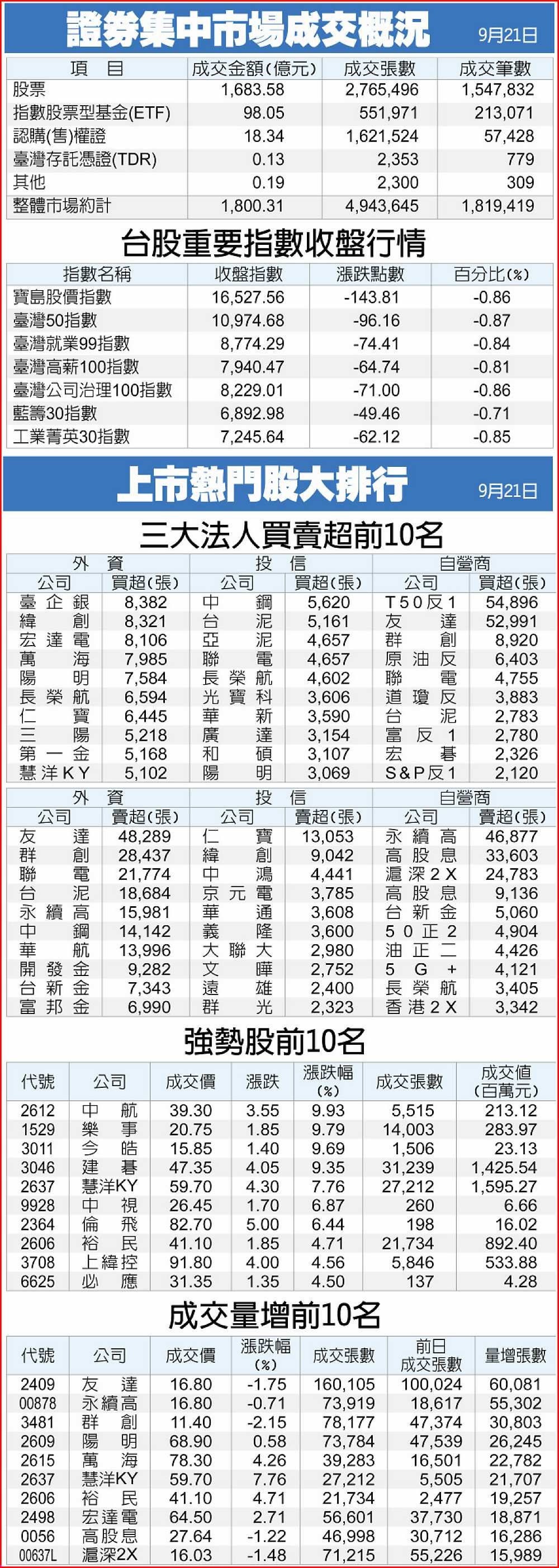證券集中市場成交概況、上市熱門股大排行