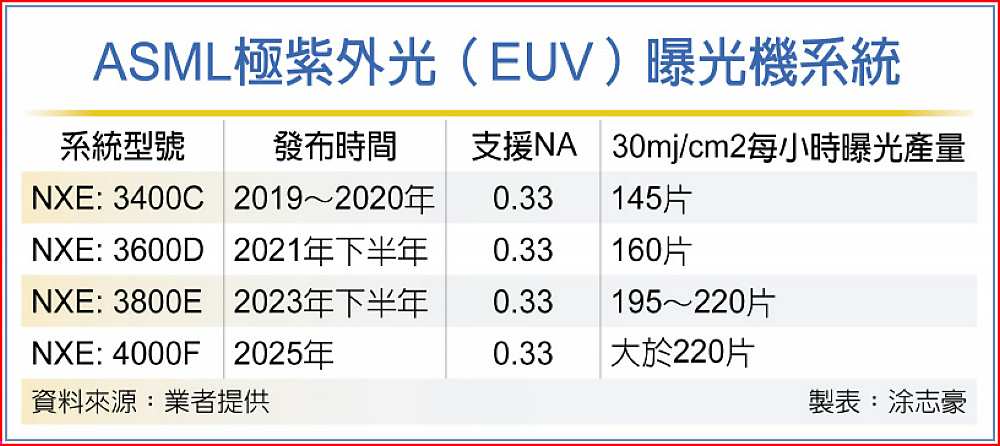 ASML日前說明EUV技術及曝光機技術藍圖,以目前主流的0.33數值孔徑(NA)來說,2021年晶圓代工5奈米製程每片晶圓平均光罩層約逾10層,但2023年製程進入3奈米之後,每片晶圓平均光罩層約將倍增達20層。