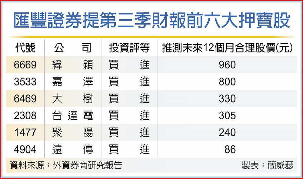 美股超級財報周財報鳴槍起跑,台股第三季財報也如火如荼進行中,匯豐證券指出,科技產業的逆風恐將持續壓抑市場表現,然在第三季財報公布前,可以由下而上(bottom-up)基本面選股原則,把握聚陽(1477)、台達電(2308)等六大標的布局機會。