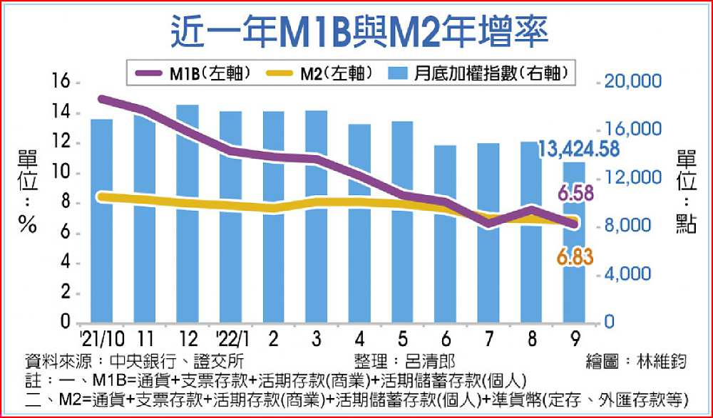 9月貨幣總計數M1B及M2年增率分別下降0.97個百分點及0.1個百分點。