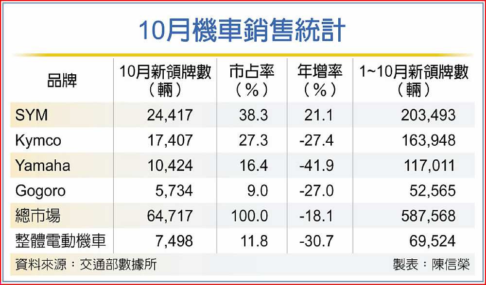 另業者指出,晶片荒問題未見緩解,讓不少燃油機車業者面臨新車、高階車款大欠車的情況,更加重10月市場的跌勢。