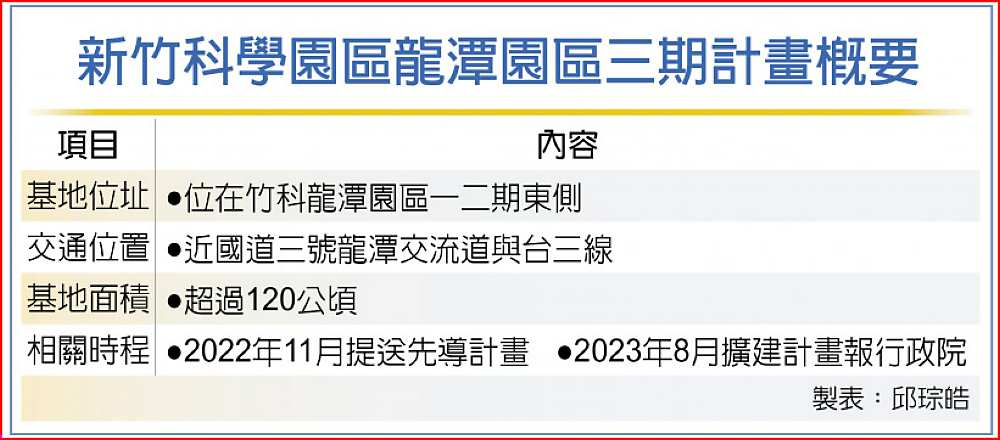 吳政忠表示,龍潭三期擴建先導計畫11月底前會送抵國科會審查,並同步展開環境監測,接著通過籌設計畫,如此可節省8~9個月時程,明年8月將擴建計畫呈報行政院,時程不會改變。竹科管理局長王永壯也說,竹科龍潭三期擴建攸關台灣半導體先進製程布局,和選舉完全無關,竹科已積極在研擬先導計畫,會盡速提交。
