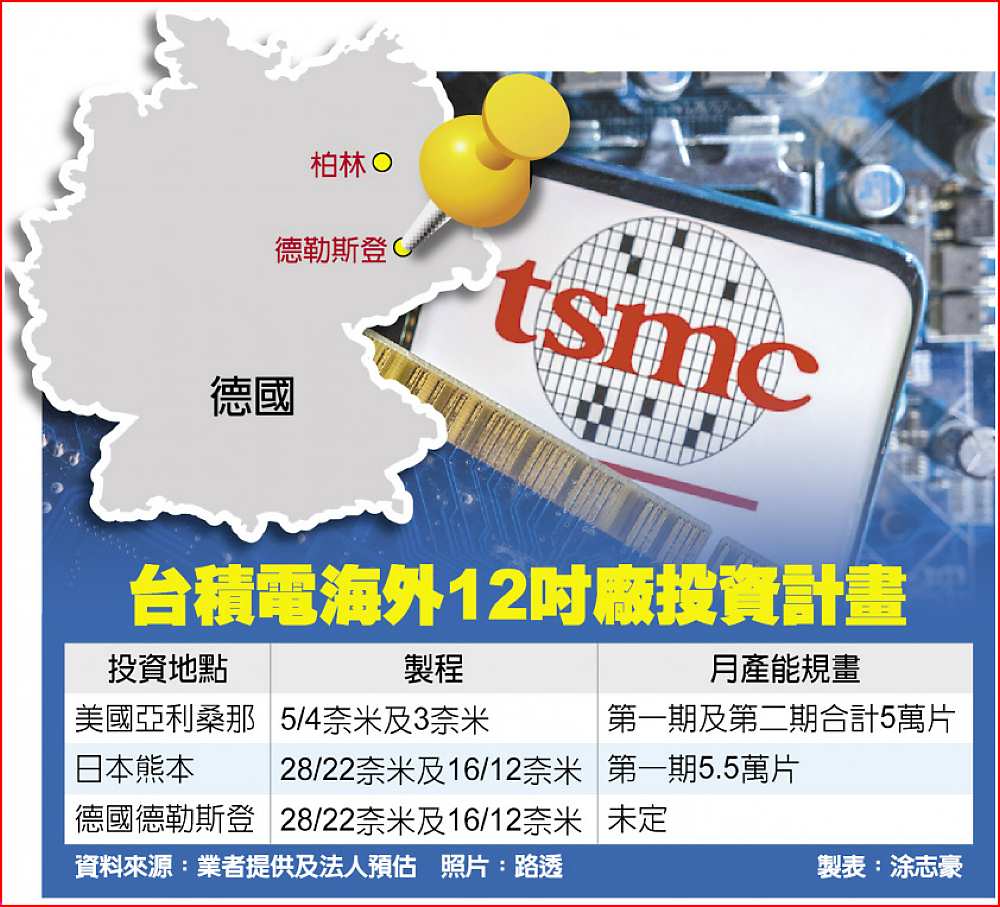雖然晶圓代工龍頭台積電尚未確認歐洲投資具體計畫,但根據設備及生產鏈業者消息,台積電傳已選定在德國半導體重鎮德勒斯登(Dresden)設廠,預計2025年起生產,以因應歐洲當地對成熟特殊製程強勁需求,並可解決歐洲地緣政治壓力。台積電預期5年後,海外產能將占28奈米及更先進製程的20%以上。