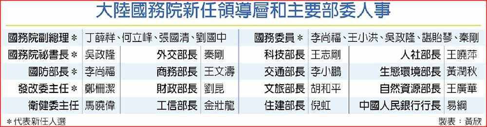 大陸全國人大會議12日召開第五次全體會議。李強提名國務院副總理、國務委員及各部委人事名單,經人大代表投票表決後,大陸國家主席習近平隨後簽署主席令,任命最新人事。