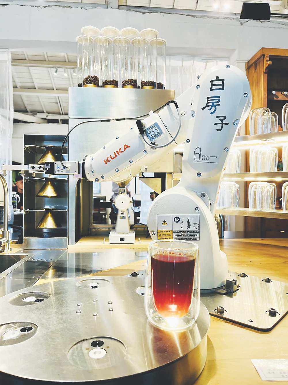 德國百年工業用機械手臂大廠KUKA聯手陽明山白房子,勇闖商業應用市場,開發「AI手沖精品咖啡機器人」。該款應用與以往完全不同之處,在於以機械手臂模仿職人咖啡師的沖泡手法,機械手夾持裝載熱水的細口手沖咖啡壺,上上下下畫圓擺動,為空氣、水、豆子譜出完美律動,透過如咖啡職人一般的手腕擺動頻率與循環,充分牽引出咖啡豆風味。