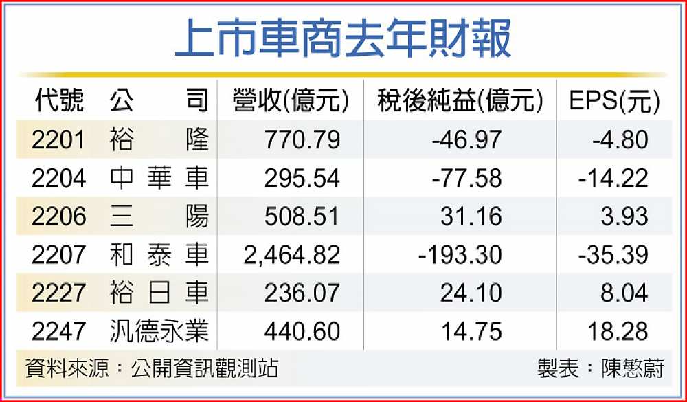 三陽(2206)、汎德永業(2247)在去年業績創高後,有信心今年繼續成長;去年受防疫險拖累大虧的裕隆(2201)、中華車(2204)及和泰車(2207),也樂觀今年篤定恢復獲利。