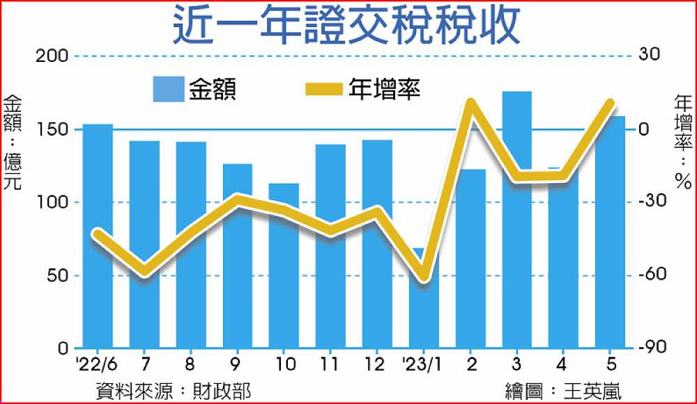 前五月證交稅合計稅收649億元,較去年同期仍減少150億元、年減18.7%,是歷年同期第二大減量。