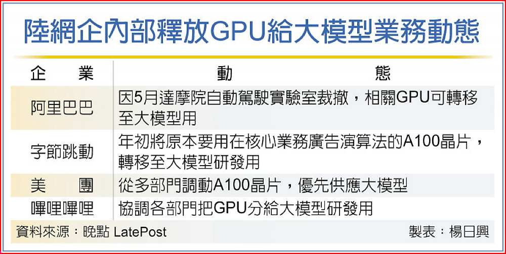 在供不應求的狀況下,陸企紛紛先設法挪用其他領域的GPU給大模型研發,報導指出,阿里達摩院5月份裁撤自動駕駛實驗室,因此原本該領域的GPU能轉給大模型;字節甚至把原本要用在核心業務廣告推薦演算法的GPU挪給大模型,反映重視程度;美團等企業也先讓其他業務使用較低階GPU,高階晶片優先供應大模型。