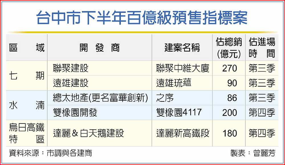 在多個百億大案下半年準備進場下,預估台中今年全年推案量上看4,000億元。