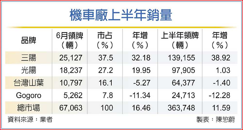 隨學生購車需求推升,6月機車市場雖較5月些微衰退,不過單月登錄數6.7萬輛,仍較去年同期成長16.46%,優於車廠預期,累計上半年領牌數36.37萬輛,年增率擴大至11.59%。三陽連14個月坐穩單月銷售冠軍,光陽則在連兩個月明顯成長後,上半年銷量年增率轉正,達1.03%。