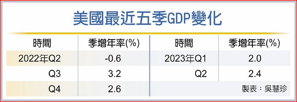 美國商務部27日公布第二季國內生產毛額(GDP)初值,多虧就業市場強韌支撐消費支出,加上企業擴大投資,季增年率達2.4%優於預期,相較第一季加速擴張,淡化美國步入衰退的隱憂。