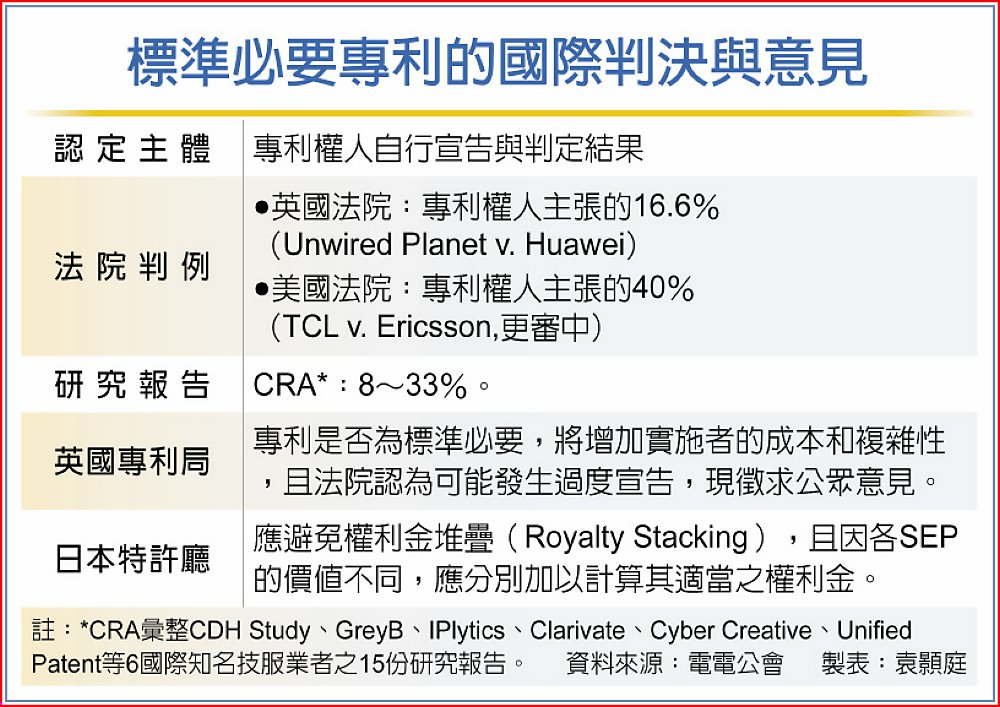 另一位評論標準必要專利過度宣告情形的與談人是工研院技轉法律中心組長張展誌博士,張展誌是臺灣交通大學的資訊工程博士,在專利分析方面則有15年以上經驗,曾擔任臺灣智慧財產局審查官訓練講師及電電公會智財委員會委員,同時也長期協助工研院通訊標準研發團隊進行4G、5G的SEPs布局工作。張展誌提及,從眾多的統計資料、研究報告及過去的法院判決中可發現:SEPs過度宣告的情形確實存在,從數份研究報告中的評估結果甚至可得知自行宣告的SEPs之「標準必要率」僅約8~33%不等,在目前標準制定組織對於SEPs是否真為標準必要,並沒有明確檢核規範的情況下,此一狀況將會持續發生。此外,專利權人所擁有的SEPs數量及占全球數量的比例,亦影響到FRAND原則之授權費率判斷,舉例來說,在2017年英國Unwired Planet v. Huawei一案,法院使用16.6%來計算所有自我宣告的LTE(4G) SEPs數量,進而計算FRAND費率。換言之,法院認定Unwired Planet的SEPs含金量不到其宣告的2成。