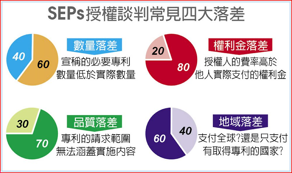 多次接受臺灣廠商委託,在國際專利戰中獲得勝訴的飛翰法律事務所(Finnegan)合夥律師楊明道專精專利訴訟、國際授權談判及智財策略。楊明道表示,授權方與被授權方進行SEPs談判時,往往有事實或理解上的落差,這些落差會導致談判沒有焦點、陷入僵局、甚至因此破裂。常見的落差可歸類為數量落差、品質落差、權利金落差、以及地域落差。(參考右下圖為例)所有差異累加起來,授權方與被授權方之間的期望或談判權利金的差別可能有10倍或更多的落差。