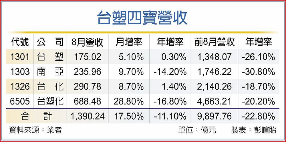 油價上漲推動塑化行情彈升,台塑四寶8月營收全面走揚,合計8月營收達1,390.24億元、月增17.5%。其中台塑化營收688.48億元、月增28.8%,表現最為亮眼,緊接在後的南亞營收235.96億元、月增9.7%。至於台化、台塑營收分別為290.78億、175.02億元,月增8.7%、5.1%,均較去年同期小幅增長。