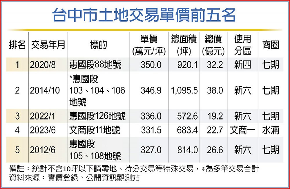 台灣房屋彙整歷年台中單價最高的土地交易案,由興富發2020年以每坪350萬買下的七期「惠國段」土地,穩居「台中地王」寶座;亞軍是豪宅「麗格」基地,2014年由大陸建設與厚生集團聯手以單價346.9萬元購入。