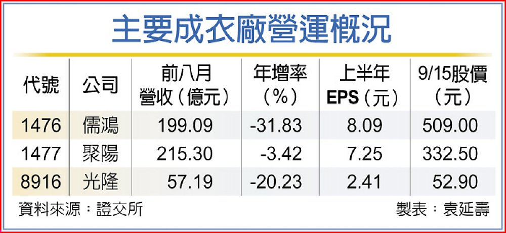 成衣廠新增及擴充印尼生產基地及產線,綜效可望從第四季發揮。在印尼產能增加下,儒鴻(1476)預期第四季會是今年營運高峰、聚陽(1477)印尼廠80條產線已被日系客戶包下,全年出貨量可望因此增加5%。