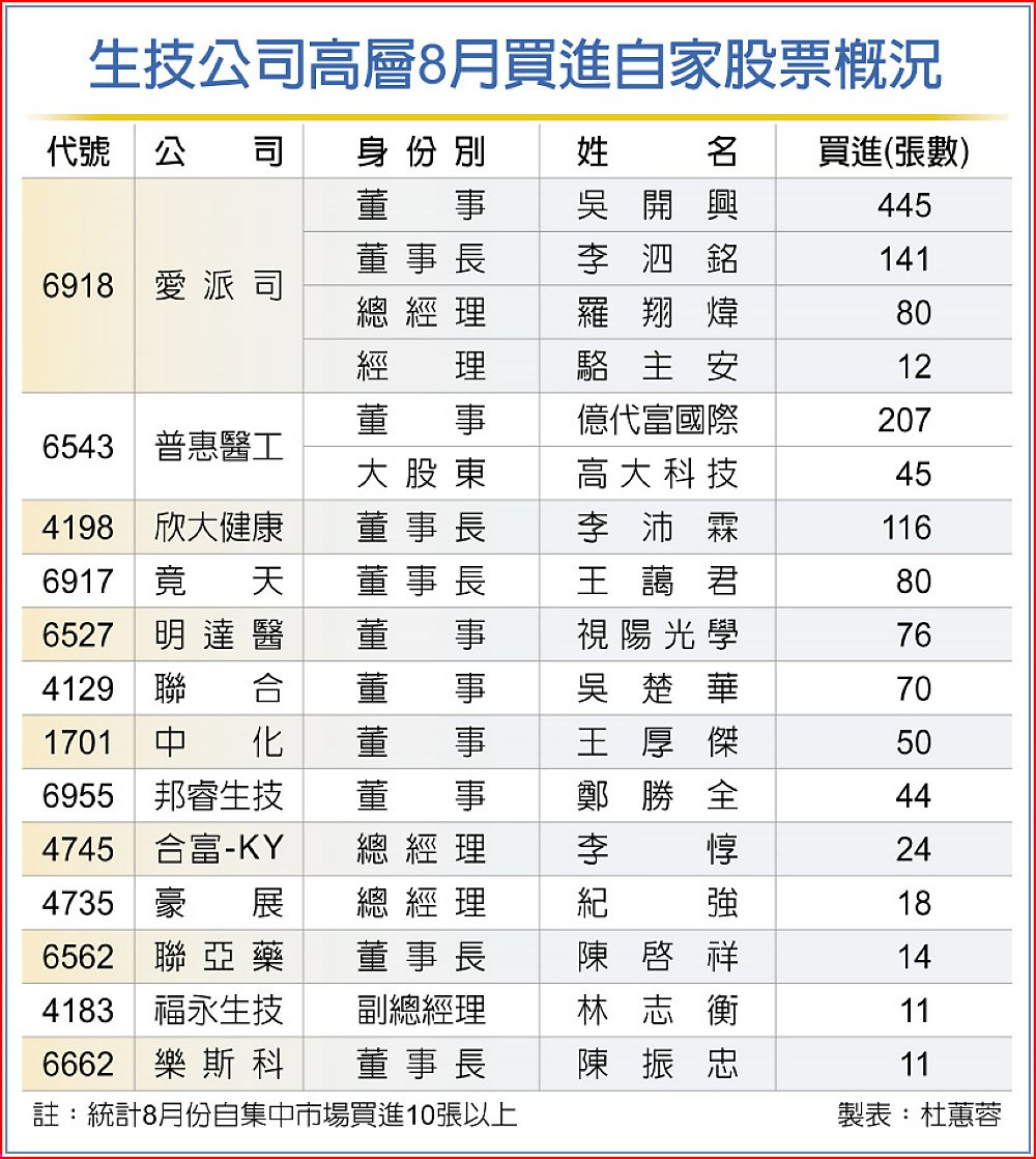 生技股低迷,近期大股東掀護盤潮,其中愛派司高層最用力,8月初以來合計買進678張居冠,其次是普惠醫工的252張,欣大健康董事長李沛霖、竟天董事長王藹君也分別買進自家股票116、80張,突顯經營階層捍衛股價的企圖心!