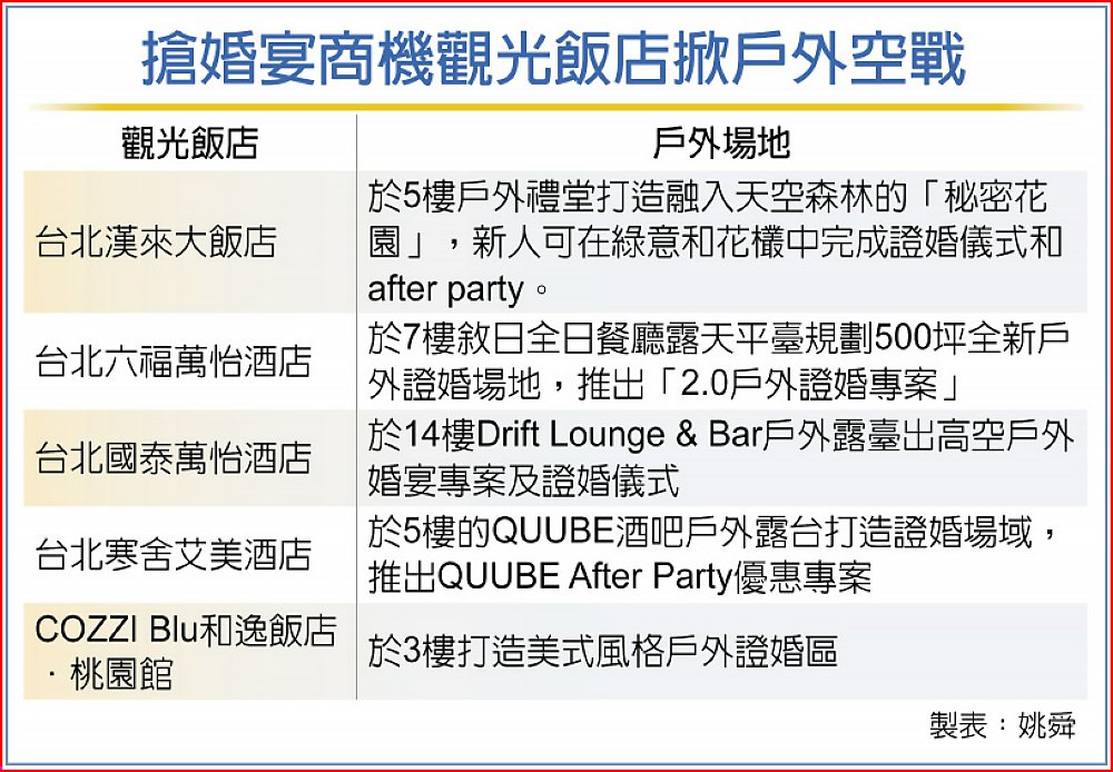 搶攻疫後新人證婚儀典與婚宴商機,台北漢來大飯店、台北寒舍艾美酒店、六福萬怡酒店、台北國泰萬怡酒店、桃園COZZI Blu和逸飯店桃園館,各自利用館內高樓層戶外露台規畫推出「戶外證婚」場地,並結合婚宴專案聯賣促銷,掀觀光飯店「搶婚空戰」。