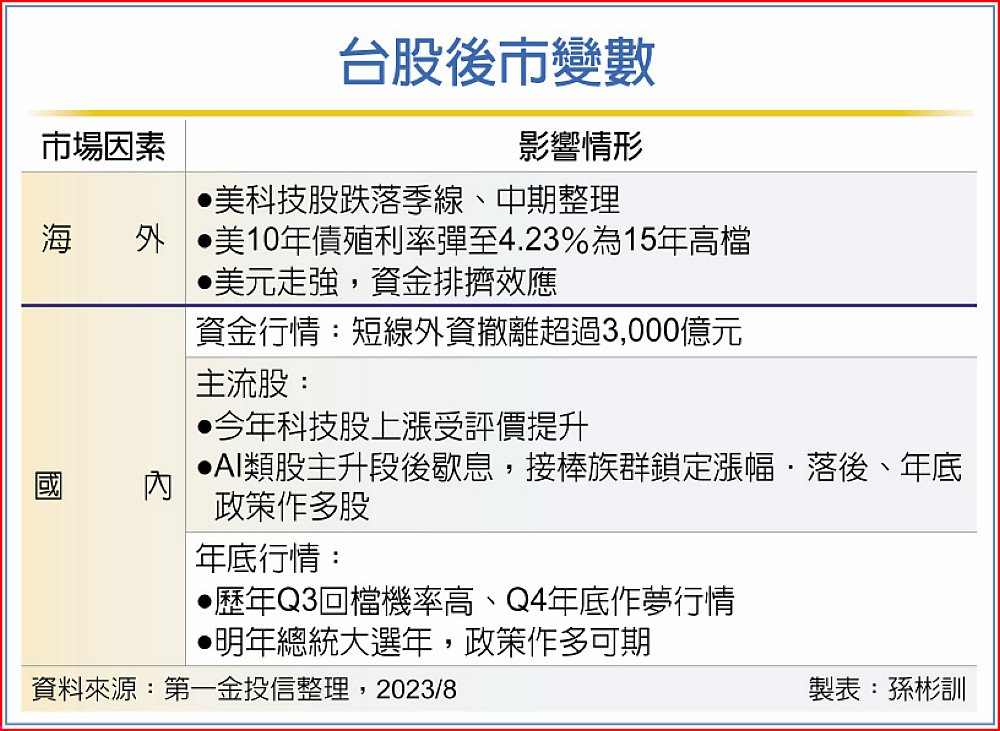 今年台股受惠生成式AI技術推升大漲,近期出現修正。投信法人指出,台股在AI帶來的主升段進入喘息整理期,歷年第三季回檔機率較高,但進入第四季後有年底作夢行情可期,加上明年總統大選年的政策作多,選舉行情將接棒演出。