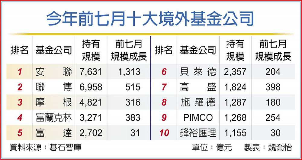 根據碁石智庫統計至今年七月底,境外基金國人持有規模最多的為安聯、聯博、摩根、富蘭克林、富達,其中,安聯的國人持有規模達7,631億元、聯博也有近7,000億元,而規模成長最多的前五大則是安聯、聯博、高盛(合併NN後改名)、富蘭克林、摩根,今年以來分別成長1,313億、515億、398億、383億、316億元。