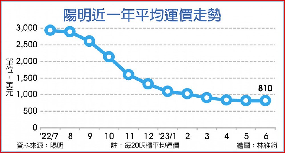 法人關注,陽明各航線損益狀況?根據陽明簡報資料,最近一年每20呎櫃平均運價,從去年7月的2,927美元一路下修跌破900美元關卡,至今年6月已跌至810美元,但近期跌幅已大幅收斂。