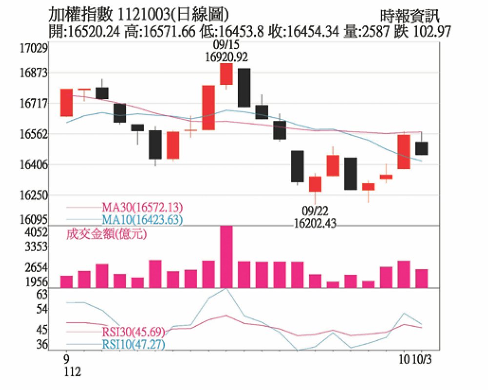 盤勢分析:美政府關門危機暫解除,美8月核心PCE指數下滑至4%以下,美科技指數反彈,一度帶動台股AI類股轉強,指數彈過10日線和半年線,向月線反彈修正,成交量略放大,9日KD值低檔轉折交叉向上,進入短彈走勢,周RSI及9周KD值向下開口略收斂轉折,中期修正壓力減緩。