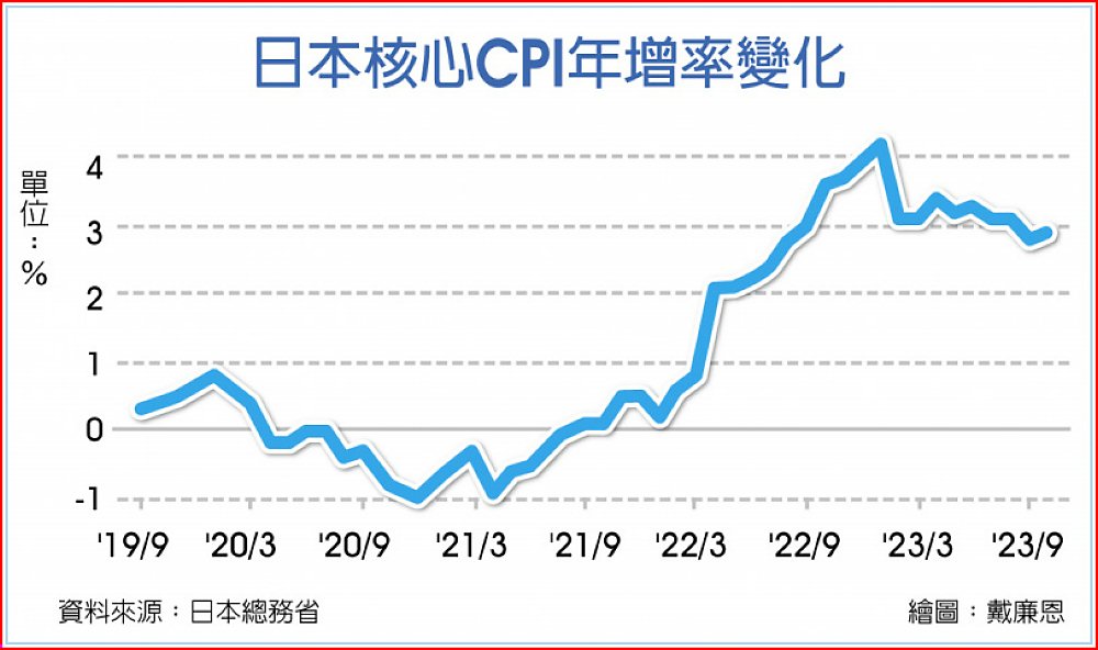 日銀偏好用來觀察通膨趨勢的指標,也就是排除生鮮食品與能源成本的「核心-核心CPI」在10月年增4%,為連續第七個月在4%之上,凸顯通膨壓力比日本當局預期更加頑強。