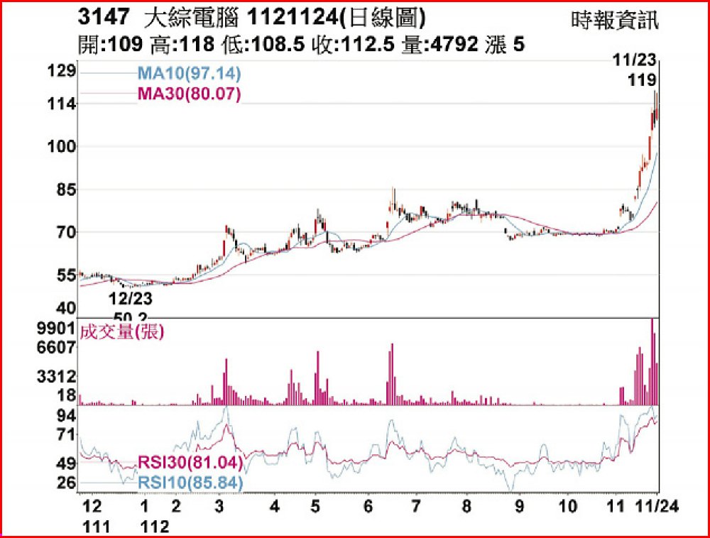 大綜自從本月2日公布第三季財報後起漲,自11月3日起迄今股價漲幅已達44.6%,24日盤中一度觸及漲停,終場以112.5元作收,漲幅4.65%,成交量4,792張。