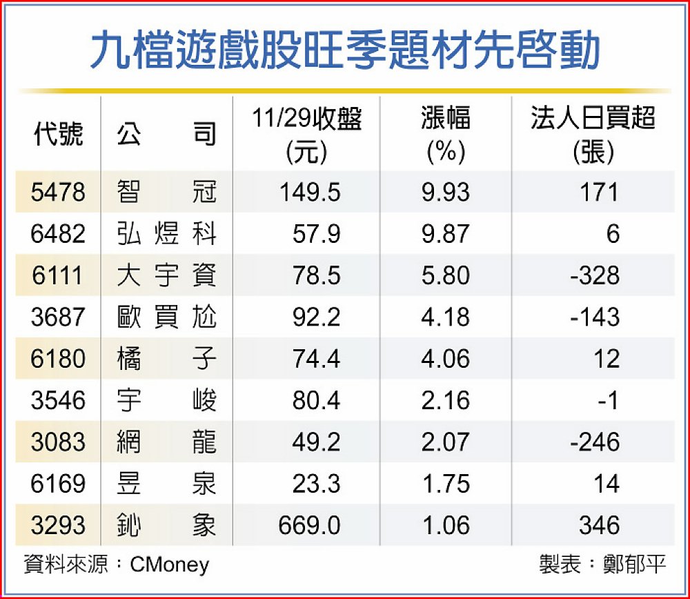 遊戲迷期待已久的年底盛事將至,以台灣獨立遊戲為主打的第二屆「G-EIGHT 遊戲展」預計12月8至10日登場,且2024台北國際電玩展也將於2024年1月盛大舉行,台股遊戲族群多頭火種提前引爆,智冠、弘煜科11月28日攻漲停,大宇資也勁揚逾半根停板,歐買尬、橘子、宇峻、網龍、昱泉、鈊象漲幅也介於1%~5%。