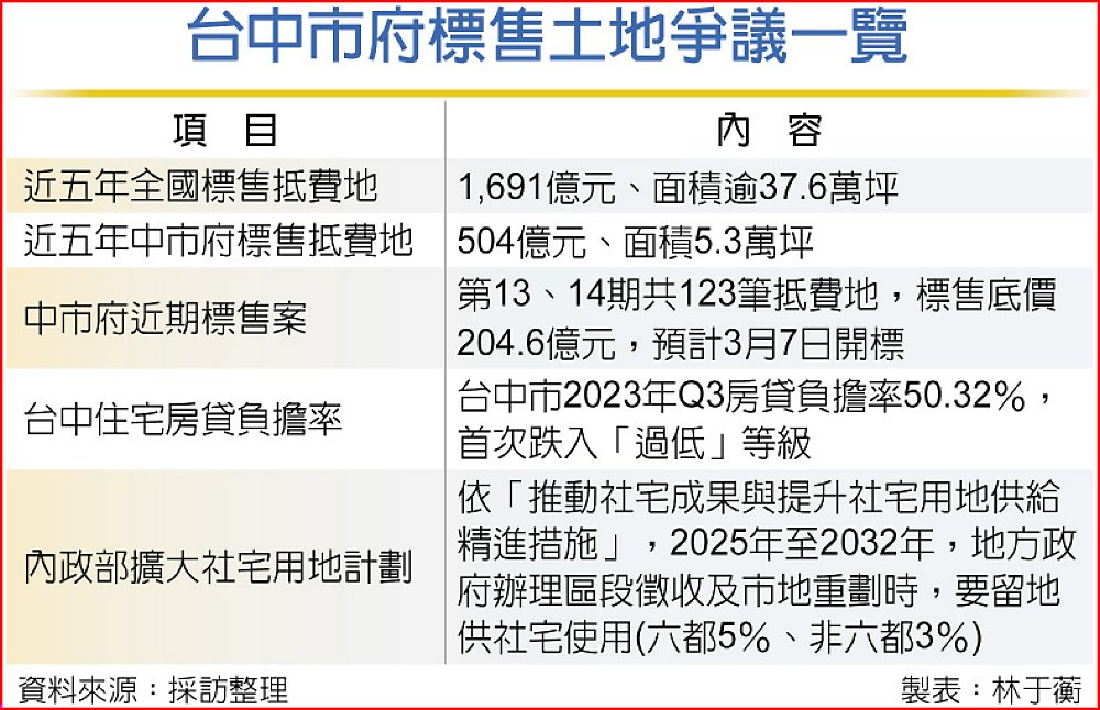 中市府2月公告標售第13期大慶及第14期美和庄市地重劃區內123筆抵費地,標售底價總金額204.6億元,預計3月7日開標。鑑於台中在去年第3季的房價負擔率首次跌入「過低」等級,內政部憂恐吸引開發業者溢價搶標,推升當地不動產市場行情,27日行文要求暫緩標售。
