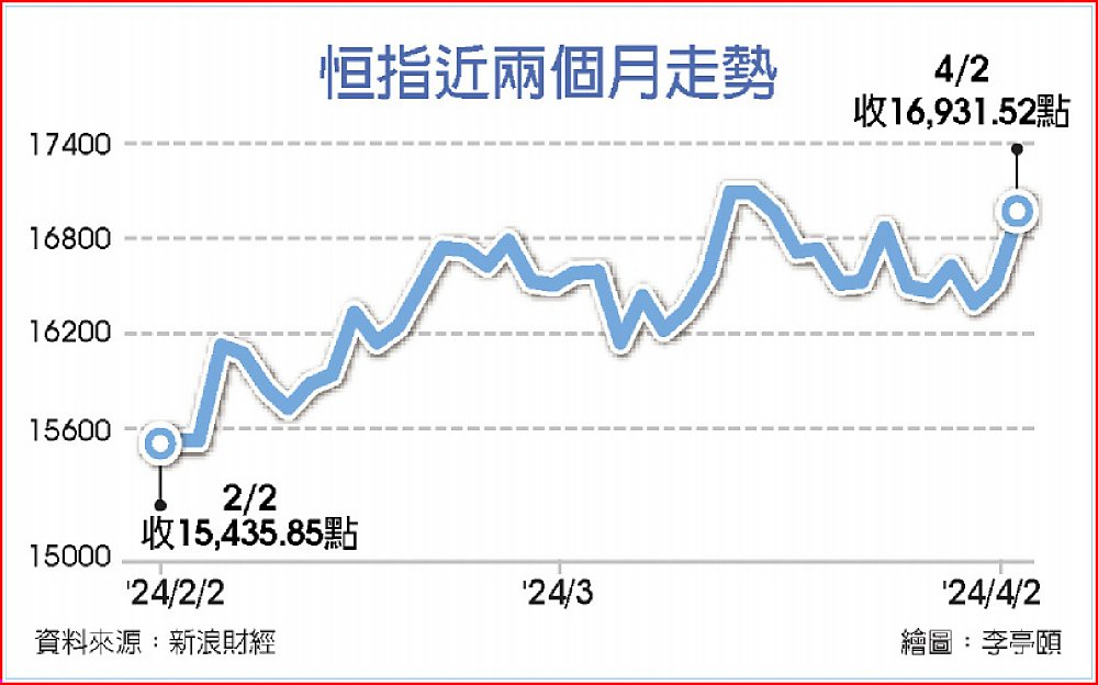 小米汽車開賣熱銷,激勵小米港股2日大漲近9%,帶動港股滿血復活。港股三大指數2日齊漲,在網路科技、黃金、石油等強勢類股激勵下,恒生指數開高走高,終場大漲390點,漲幅高達2.36%,收報16,931.52點,有望叩關17,000點大關。另外,恒生科技指數漲1.89%,國企指數漲2.58%。