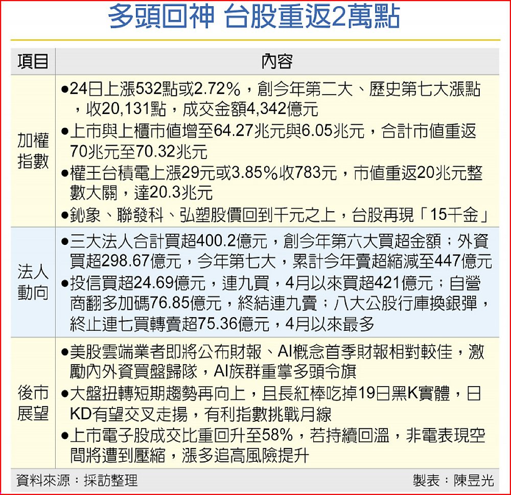 AI股吹響反攻號角,在外資擴大買超298億元搶進下,激勵台股24日大漲532點,創今年以來第二大、史上第七大漲點,終場收20,131點,重返2萬點,上市櫃合計總市值也站回70兆元。