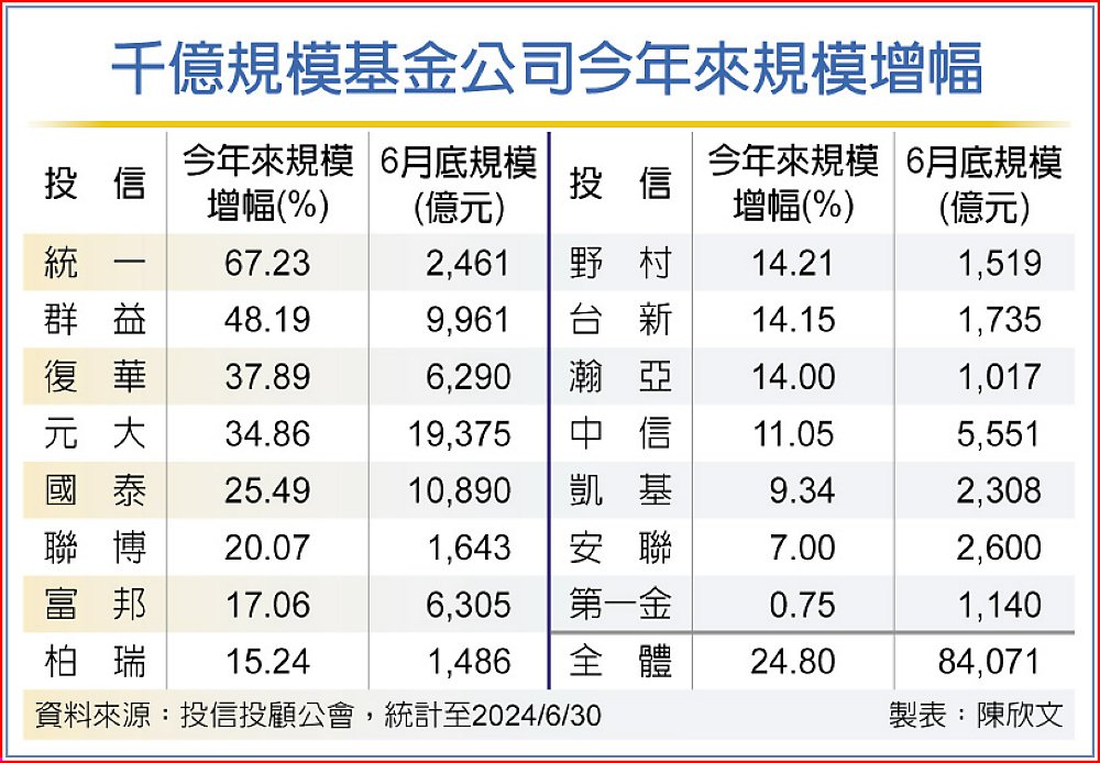 市場多頭行情吸引大量資金湧入,推升基金淨值,亦帶動資產管理業規模大幅成長,據投信投顧公會統計,38家基金公司今年以來總規模大增24.8%至8.4兆元,有15家規模超過千億元,其中因台股高息ETF熱賣,元大投信將邁向2兆元,群益投信有望叩關兆元,統一投信規模增近7成,成長率居冠,投信公募基金規模上半年大增1.67兆元。