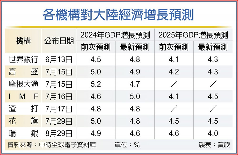 另外,根據其他主要機構在6、7月公布的預測,摩根大通將大陸今年GDP增長預估從5.2%下調到4.7%;世界銀行和高盛則將2025年增長上調到4.3%。目前看來,瑞銀的看法最為悲觀。