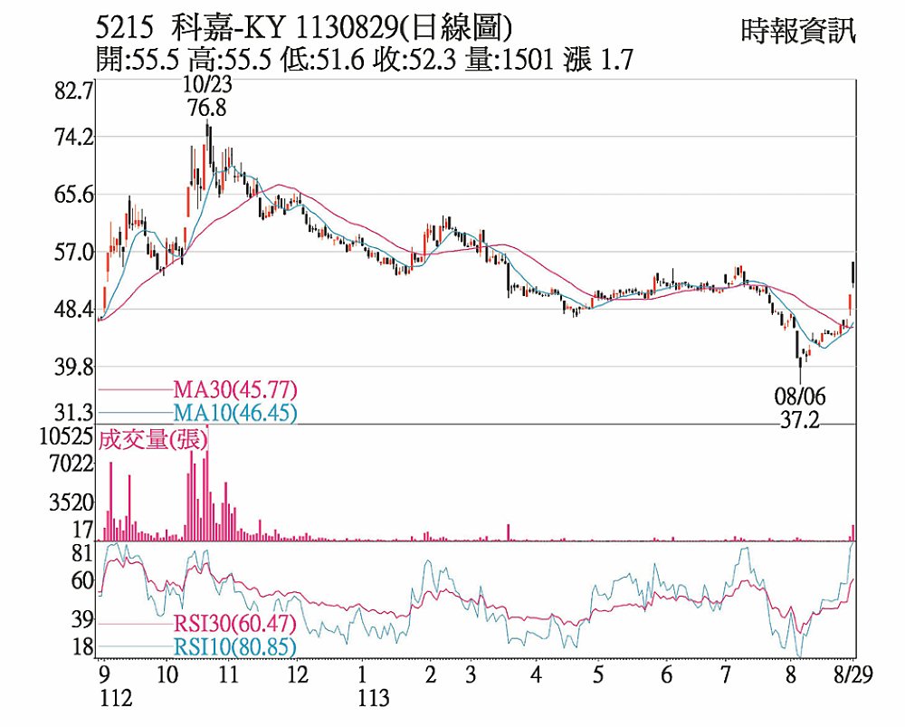 薄膜觸控開關(MTS)廠科嘉-KY(5215)股價觸底、緩步反彈向上,29日上漲3.36%作收,收盤價52.3元,站回所有短期均線之上,成交量則是放大到1,495張。