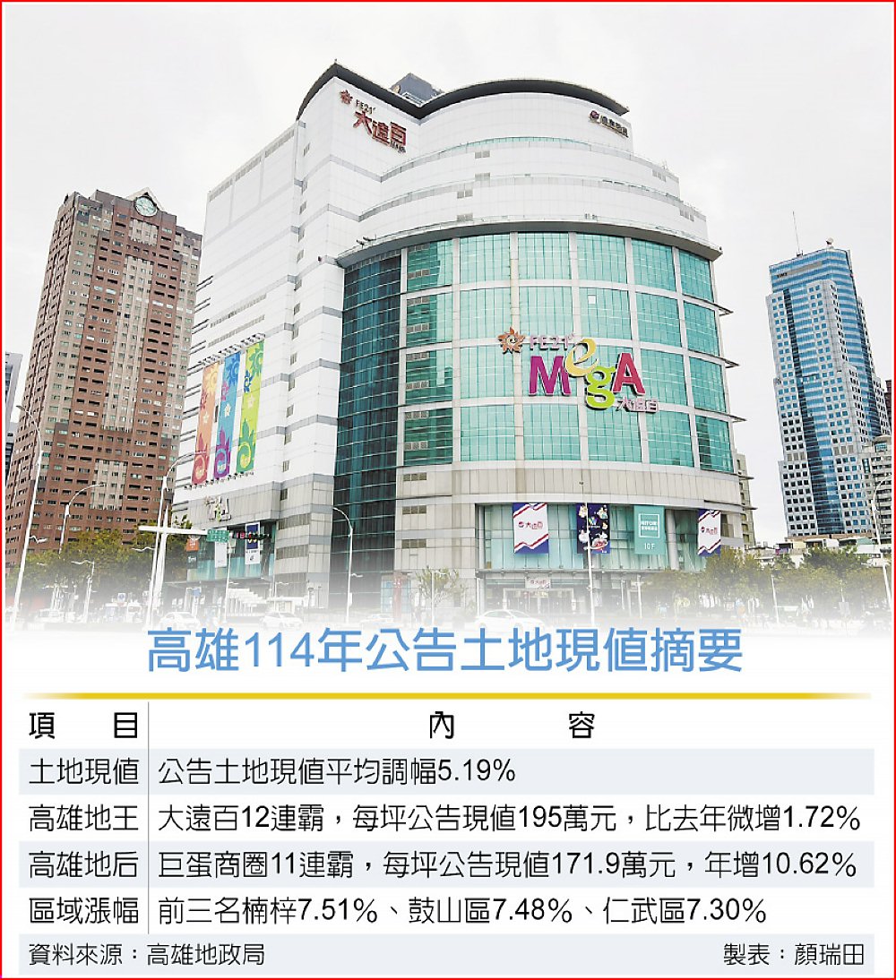 台積電等半導體、高科技業大舉投資進駐,推升高雄地價,高雄市公告2025年土地現值平均調幅5.19%,最高地價區段仍由高雄大遠百連續第12年蟬聯地王,公告土地現值為每坪約195萬元,比前一年微增1.72%;高雄地后則是巨蛋生活圈的博愛二路區段(裕誠路與明華一路間),公告土地現值每坪約171.9萬元,年增10.62%;以行政區來看,調幅最高的是楠梓區7.51%,主因受台積電效應影響。