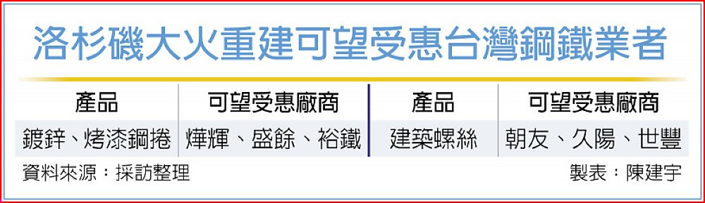 延燒一個月的洛杉磯大火終於獲得控制,重建行動也陸續展開,據統計有超過1.6萬棟建物需要重建,為台灣鋼鐵產業廠商帶來商機。業者表示,包括鍍鋅、烤漆鋼材、建築螺絲等用量都將增加。