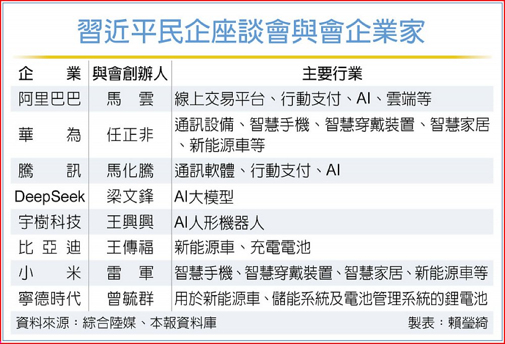 根據外電報導,17日召開的座談會,正逢2月初美國總統川普宣布對中國加徵關稅,「貿易戰2.0」開打,且不久前杭州深度求索「DeepSeek」橫空出世,宇樹科技也分別在人工智慧和機器人領域在全球掀起討論。另有分析指出,對照2017年川普首任時舉行的民營企業家座談會,當時發言的企業家大多來自傳統行業,本次則包含互聯網巨頭及尖端創新企業,且2025年,也是過往其政策全力推進「中國製造2025」目標達陣之年,座談會舉行時間頗堪玩味。