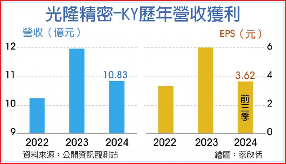 光隆精密去年營收10.83億元、年減9.56%,前三季稅後純益1.23億元,每股稅後純益(EPS)為3.62元。對今年營運展望,呂皇甫指出,隨著既有客戶今年拉貨動能轉強,再加上新案開發陸續出貨,今年營收獲利可望挑戰突破2023年的歷史新高。