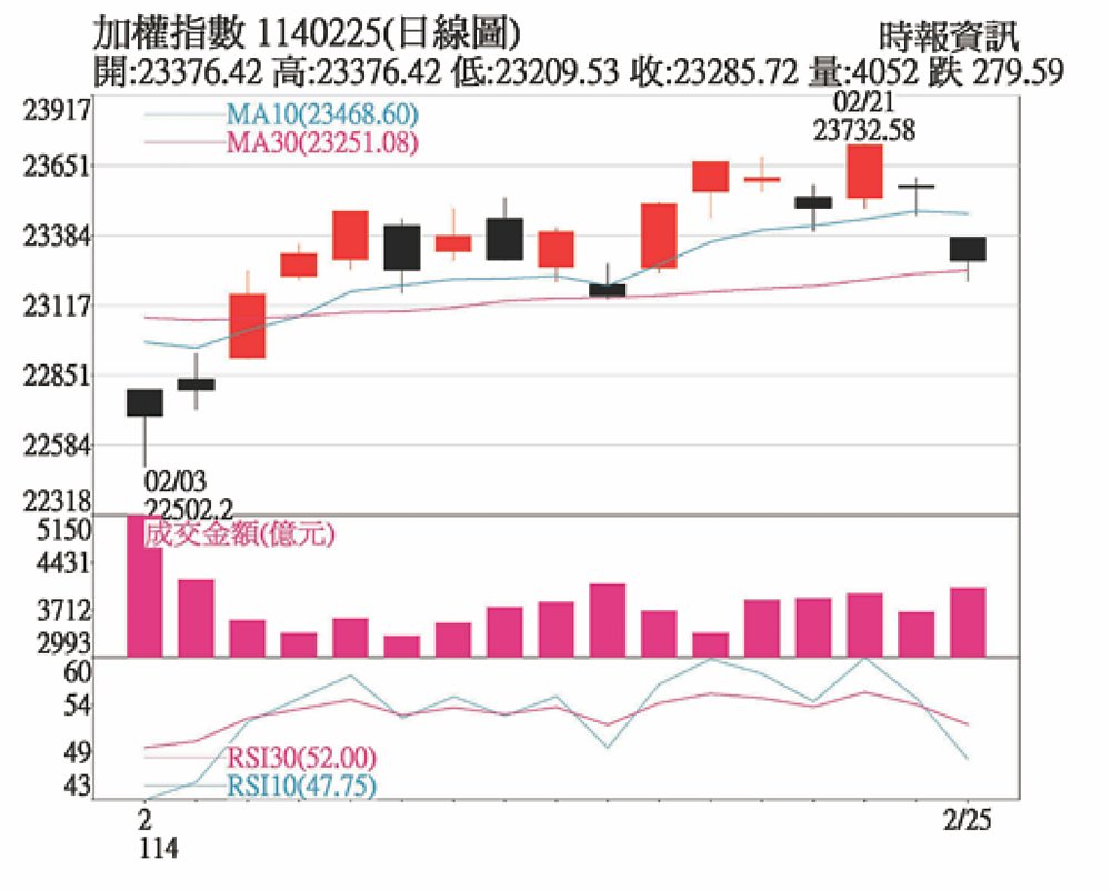 2月美國服務業PMI由前月52.9驟降至49.7,創2023年1月以來新低,衝擊美股短線獲利回吐賣壓出籠,也影響台股多方的信心。川普要求北約國家增加國防支出,北約主席呂特建議至少達GDP3%,同時,眾議院共和黨提出未來十年要求增加3,000億美元國防、移民執法和邊境安全支出,可留意軍工題材是否再度發酵。
