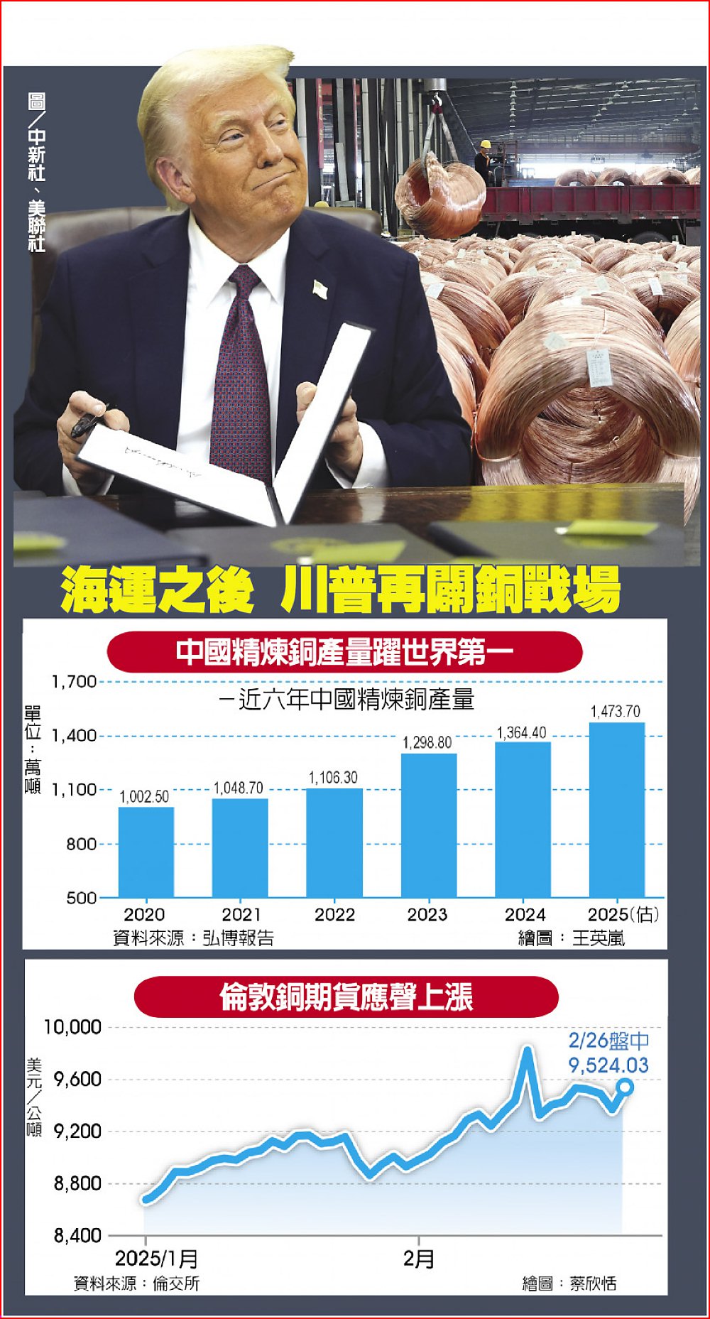 美國總統川普發起的關稅戰再開新戰線,他於25日簽署行政命令,宣布對美國進口銅產品展開國安調查,並評估加徵關稅的可能性。中國大陸是全球最大的銅產品生產國和消費國,最新動作無疑劍指中國銅業。