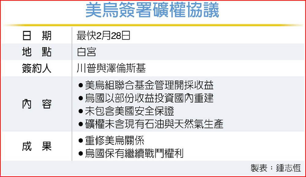 外媒引述消息人士透露,烏克蘭已同意跟美國簽定礦權協議,最快可望28日在白宮由兩國元首川普和澤倫斯基親自簽署。由於雙方均有退讓而達成共識,使美烏得以重修關係。
