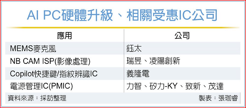 法人分析,電源管理IC亦將受惠功耗遞增、穩定成長,如CPU核心電源管理系統之矽力-KY、GPU獨顯V-Core力智,或記憶體升級至DDR5/LPDDR5之相關PMIC業者茂達及致新,都將是AI PC規格升級受惠業者。