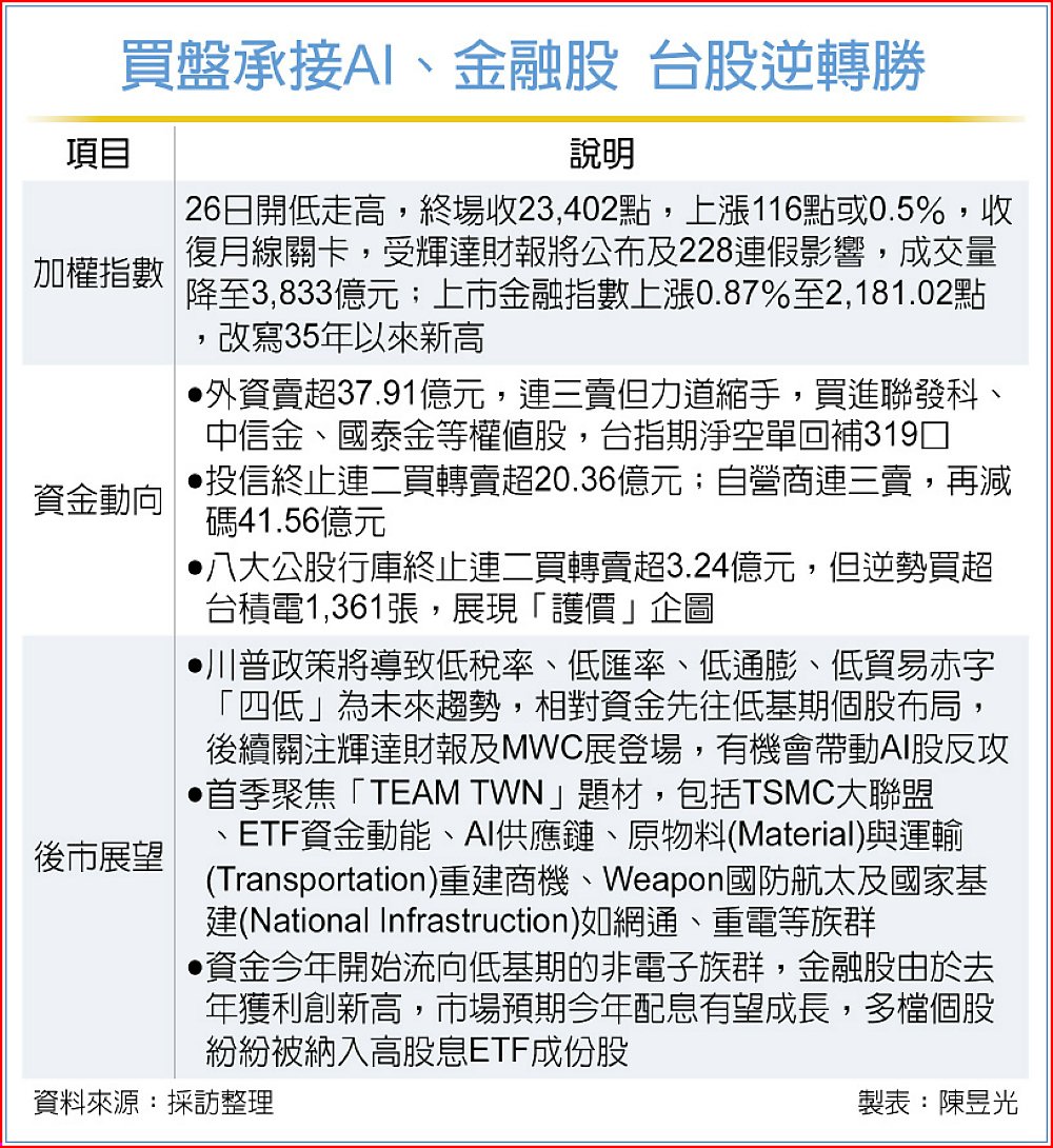 輝達財報將公布,台股26日率先走出低迷氣氛,在押寶AI買盤進駐,以及金融股發揮撐盤作用之下,加權指數開低走高,終場上漲116點收23,402點,不僅回防季線有守,更成功收復月線關卡,成交量則因觀望輝達財報與228連假將屆,縮減至3,833億元。