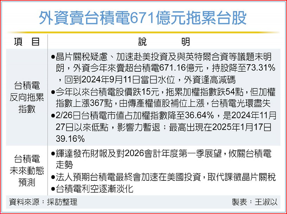 因美國總統川普上任,屢屢點名要課徵台積電晶片關稅,並傳聞除了加速赴美國投資外,亦開出與英特爾合資或技術移轉英特爾等條件的疑慮滿天飛,當前遭受美國政治性打壓,台積電每一步規畫走得戰戰兢兢、如履薄冰,外資減碼台積電不手軟,今年以來拋售台積電671.16億元,持股降至73.31%,回到2024年9月11日當日水位,今年以來股價跌15元,一檔拖累今年來加權指數跌54點,所幸由傳產權值股補位帶動今年來指數上漲367點,台積電影響力減退。